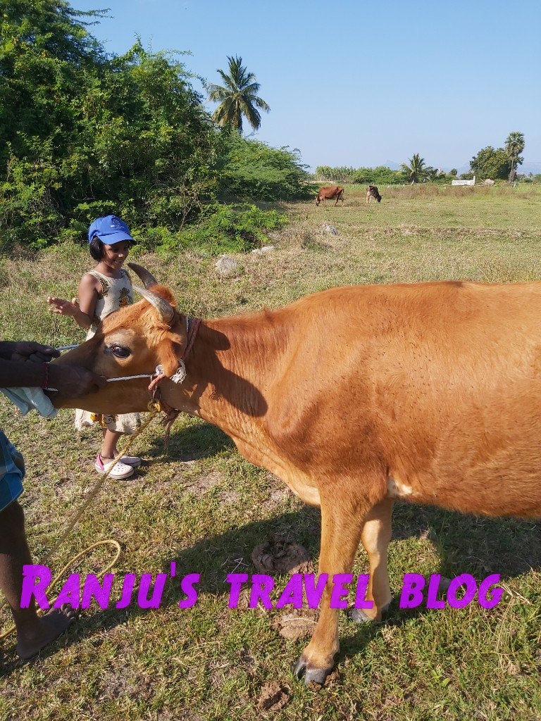 After worshipping we had lunch by 1pm at GRT Regency and made my grand daughter play in the swing and then went to our farm and spend an hour walking . She was excited to see the cows , goats in the farm and started playing in flowing water .