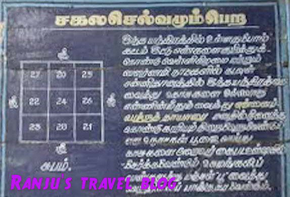 Lakshmi Pooja As the name suggests , this is the temple for wealth , prosperity and all the wealth in the world . There is a nine squared matrix drawn in front of the Ennai Petra Thaayar Sannathi as shown in the picture , which has specific numbers . By repicating this matrix in your pooja room and placing one rupee coins ( or any coins such as quarters if you are out of India ) on each of the squares, and praying for nine days , it is proven that once prayers and wishes are granted.