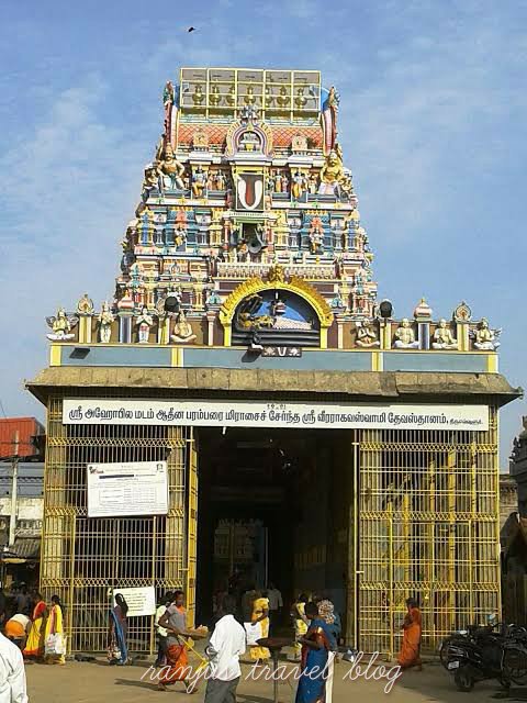 The presiding deity Veera raghava perumal is in a reclining position in the temple. The lord’s right hand is positioned on Salihothra Munivar’s head while the left hand is in the Gnana Mudra position indicating the teaching of the four Vedas to the Lord Brahma.