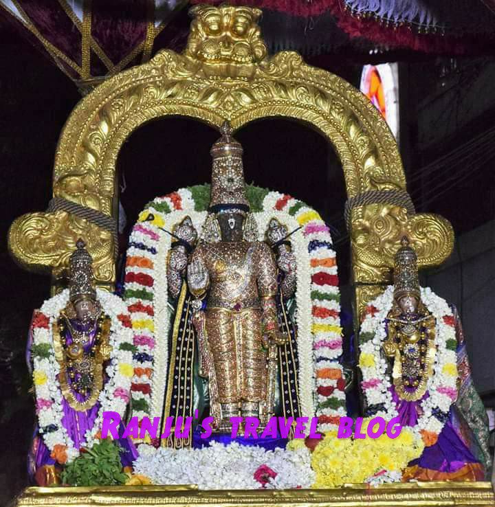 This is one of the 108 Divya desams. The name of the place came from the term – Allikkeni , meaning the temple tank of Alli flowers called Kairavinisaras. Per Legend, Thiruvengadamudayan gave dharshan as Krishnan to Chola king Sumathirajan per his request and so the deity is called Venkatakrishnan and the vigraha was installed by Attreya maharishi . The main deity is in the form of charioteer and so has a big moustache and the whole family of Krishnar – consort Rukmani , elder brother Balaramar , younger brother Satyaki , son Pradhyumna and grandson Anirudha are present in main shrine which can not be seen anywhere else. Since Krishnar promised not to take any weapons in His hands during the Mahabharatha war , He is seen here with Sangu only ( without the Chakra ) . The Utsava vigraham bears scars supposed to be from the arrows of Bheeshmar , when he was the charioteer to Arjuna in the Mahabharatha war .