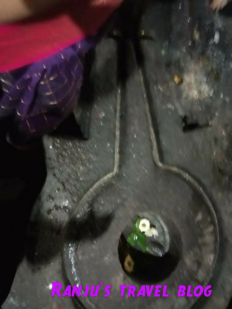 We were able to see the Nirmalya ( before keeping the silver head on the Lingam ) dharshan of this Jyothirlingam . This Jyothirlingam has 3 small lingam formations within it , after abishegam ( a ritual done for the lingam before they decorate with flowers and clothes ) they cover it with a silver head . These 3 formations are considered as Lord Shiva Lord Vishnu and Lord Brahma . Water was over flowing from the linga .