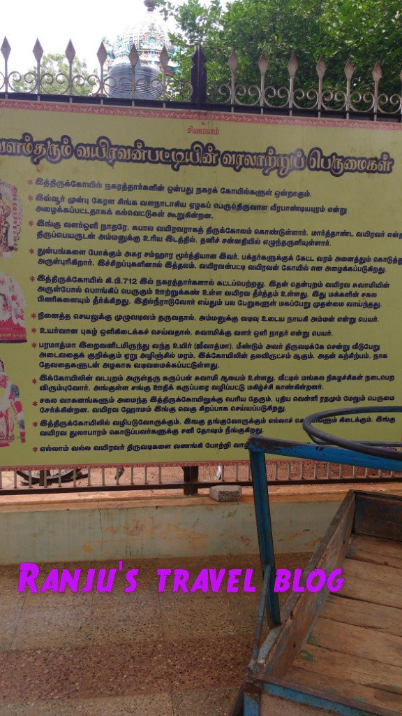 The legend behind the temple goes like this – Kashyapa Munivar’s son Sooran did a severe penance towards Shiva and he was granted a wish that no one can destroy him other than Lord Shiva himself . Riding on the glory of his invincibility he was torturing and killing the Devas. Indiran went to their leader Brihaspati. Brihaspati said that only Lord Shiva can solve this . Indiran went to Lord Shiva. Lord Shiva took the avathaar as Bhairavar (Vairavar in Tamil) and destroyed Sooran. He then appeared as a celestial light (Peroli). He is the one presiding here as ‘Valaroli Nathar’.