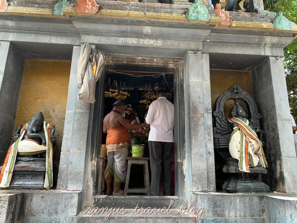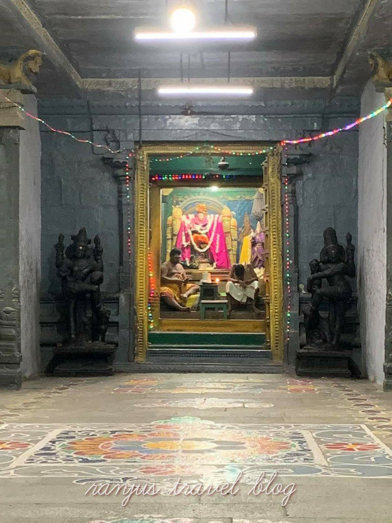 The bottom half of the gateway tower has the shrines of Vinayaka and Murugan on either side. Here Vinayaga is on peacock which is very unusual.