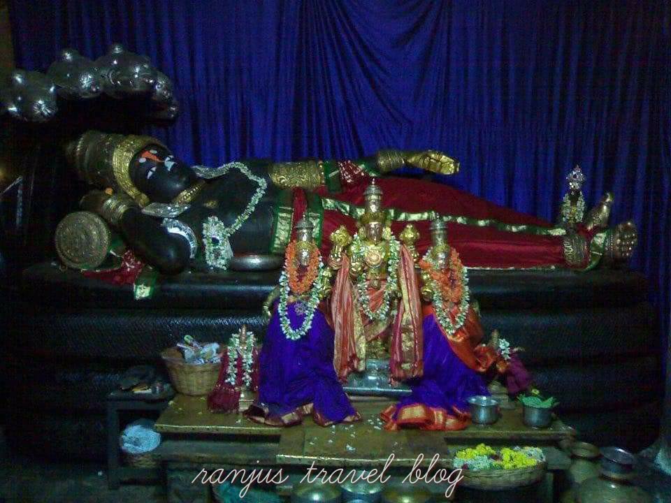 Srirangapatna Ranganathaswami Temple is one of the largest temples with a lofty tower. The Lord is reclining on Adi Sesha with the Goddess in His chest. The murti of sage Gautama and Goddess Cauvery are enshrined at the holy feet of the Lord.