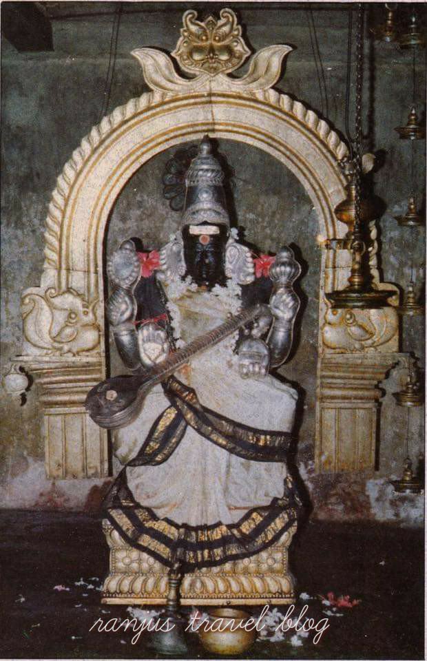 The main deity Goddess Saraswathi, in a penance performing posture, confers Her blessings on this world as the prime deity, only in this temple. A beautiful three eyed form, with one leg folded in a yogasana pattern, is afeast for the eyes. Another special feature is that there is no veena in Ambal’s hands in the prime deity.