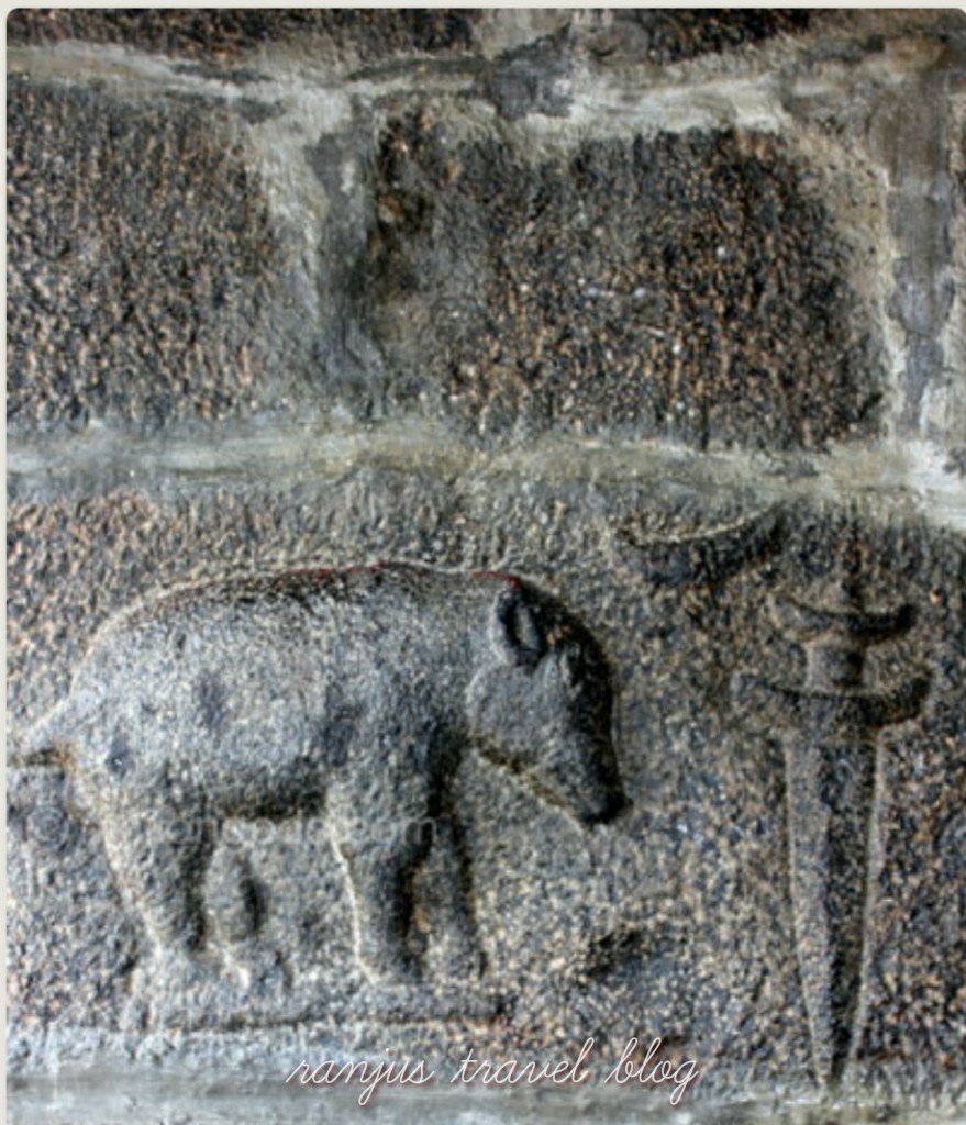 The seal of the Vijayanagar Empire – boar, dagger, sun and moon are seen outside the temple on the wall.