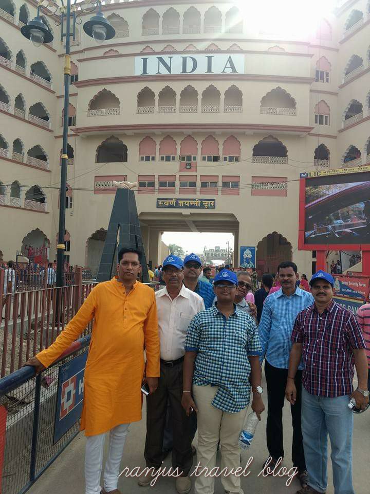 By 11am we started from Hotel Ritz plaza Amritsar by 1.30 pm we had a lunch break , that took a hour . By the time we reached the Wagah border it was about 2.45 pm . The building was a huge spherical gallery over crowded as it was vacation period . Our tour organizer managed to get places from where we can view the procession comfortably . The procession starts depending on the sunset and that day it started by 6PM though we assembled an hour before . It’s better you be there by 4 pm itself ,because if its overcrowded entry will be denied . No entry fees are collected. Purses , handbags any covered bags are not allowed .Mobiles and cameras are allowed .There are vendors selling water bottles , snacks and cool drinks . Even National flags and caps are sold there but we had our own tour caps.