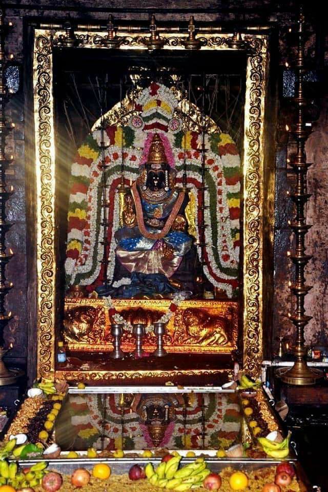The deity is seated resting her folded right leg on the sea in a Abhaya ,Varada Mudra posture t. Her left leg is in Sukhasana posture. She is said to be in Manonmani Swaroopa and hence is also known as Santanayaki. The Goddess is installed over Sri Chakra and is seated with her right leg folded.