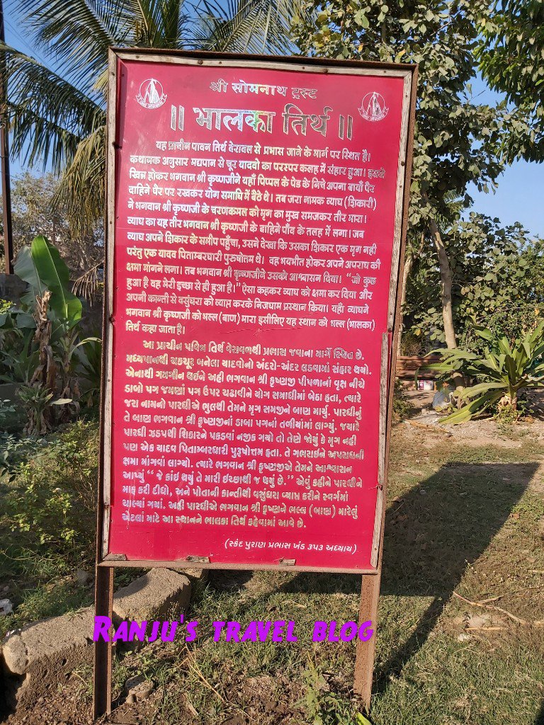 It is mentioned in the Bhagavata purana that a hunter named Jara mistakenly throws an arrow at Krishna which hits His feet thinking it to be a deer . Lord Krishna then throws away the arrow and Ganga emerges out from the spot where the arrow hits the ground. Hence the name bana (arrow) teertha. There is a modern temple with a marble idol of Krishna marking the spot where He rested. The stump of the ancient tree is still preserved in the temple.